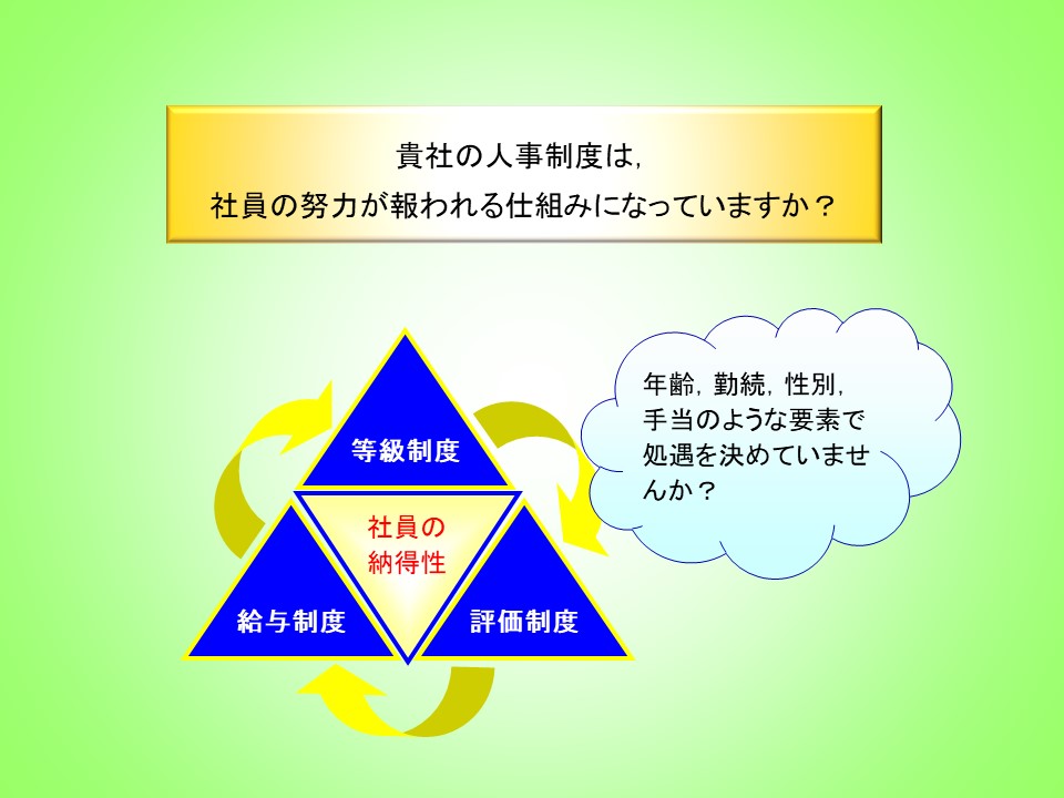 人事制度については,その仕組みを十分理解していないことから,あまり重視していない経営者がいることも承知しています。しかし,昔から「企業は人なり」と言われてきたように,企業が業績を伸ばし持続可能な存在として社会に受け入れられるためには,そこで働く社員のひとり一人が生き生きと会社に誇りを持って働ける環境をつくることが一番重要といえます。