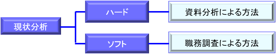 現状分析の方法は次の2とおりです。1つはハード的アプローチで,現行人事制度を運用するのに必要な全資料を分析する方法です。