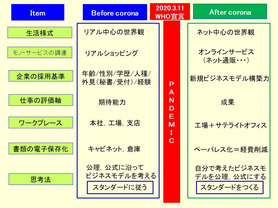 2020年3月から始まった新型コロナウイルスの蔓延により私たちの生活様式は大きく変貌しました。上記に示すように,コロナ以降の新たな環境に適合するように私たちの思考・行動は大きく変わりました。